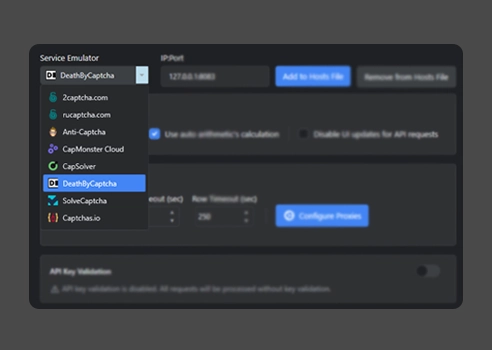 Choose which CAPTCHA solving service API to emulate. CapSkip supports all major services, including 2Captcha and Anti-Captcha. You can enable API key validation to generate and manage API keys, adjust confidence thresholds, and select different models as needed.